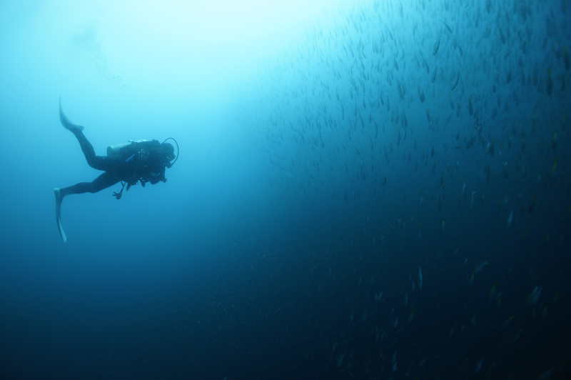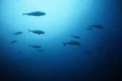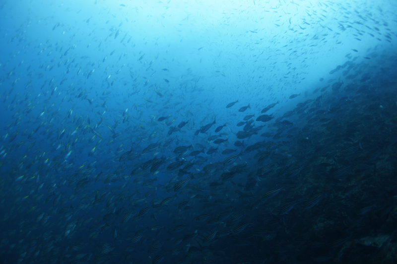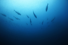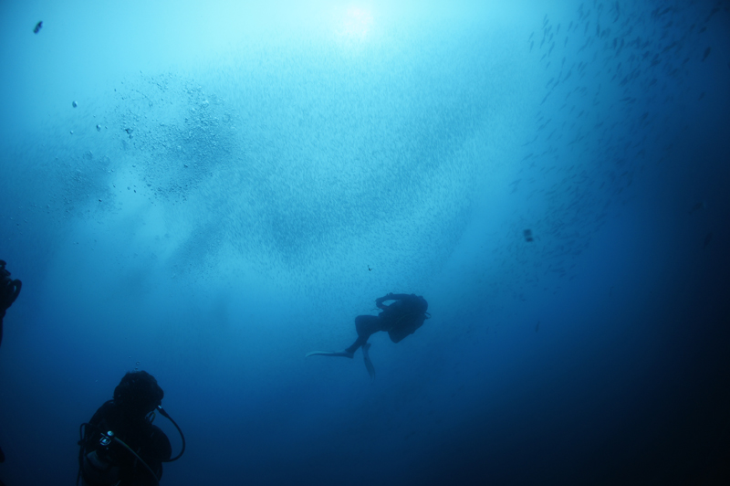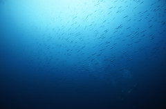 南に行ったチームは、ワラサの群れに安全停止中メジロザメ&ハンマー。