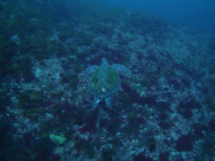 大きなアオウミガメに絡むカンパチの群れ、シマアジの群れ!