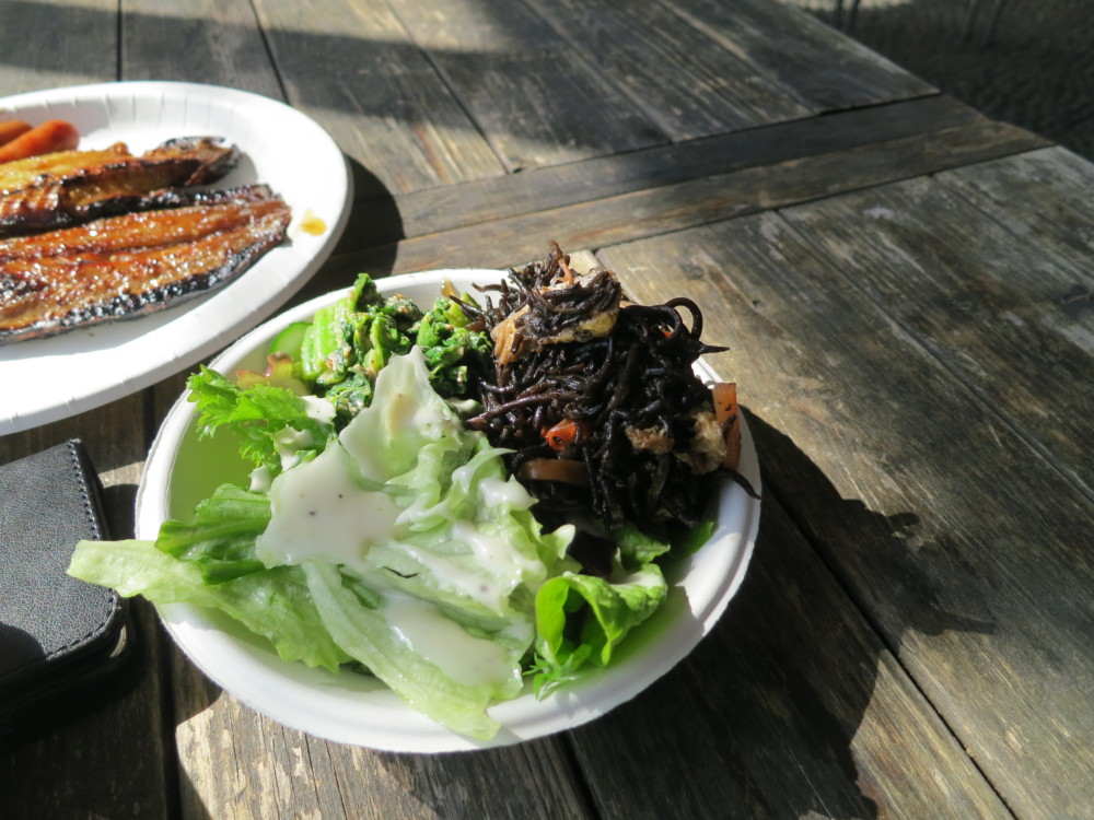 昨日は今年3回目のサービスデーでした。天候が心配されましたが無事開催。気になる今回のランチは干物バーベキュー。干物はアジとサンマの味醂、鶏飯、わらびと豆腐と油揚げのお味噌汁、ヒジキの煮付け、かき菜の胡麻あえ、ウィンナー、グリーンサラダでした。今回のオススメはかき菜の胡麻和えとヒジキの煮付けでした。都会ではなかなか味わえない優しい美味しさがいっぱい。メインは勿論ですがサイドメニューもバリエーション豊富なのでご注目。次回は4/17(水)、お楽しみ下さい。いつも変わらずのご利用ありがとうございます、お疲れ様でした。