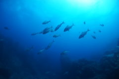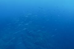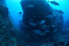 カンパチの群れ、イサキの群れ、タカベの群れ、コロダイの群れ、ハマフエフキの群れ、クロホシフエダイの群れ、