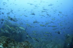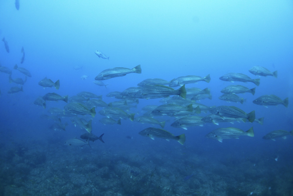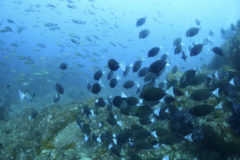 タカベの群れ、イサキの群れ、タカサゴの群れ、ニザダイの群れ、メジナの群れ、イシダイ、など