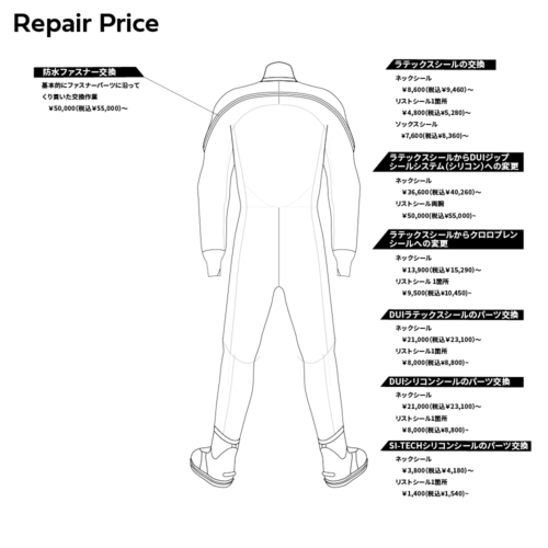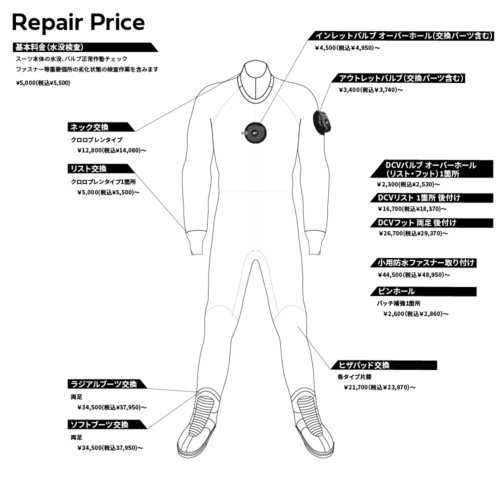 基本料金に含まれる内容:スーツ本体の水没、バルブ正常作動チェック、ファスナーを含む重要個所の劣化状態の検査作業