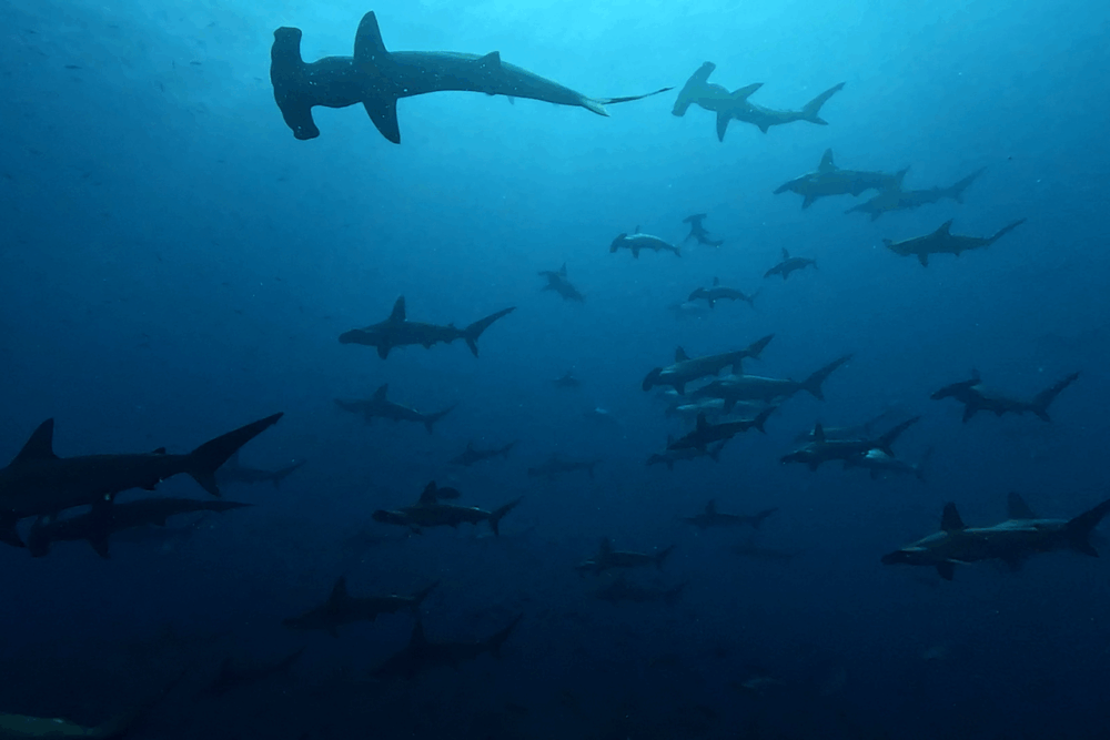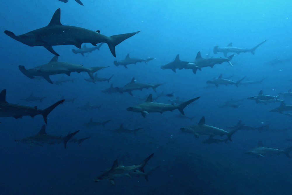 100匹を超える群れが、青い潮を背景に悠然と行進する姿はまさに圧巻。