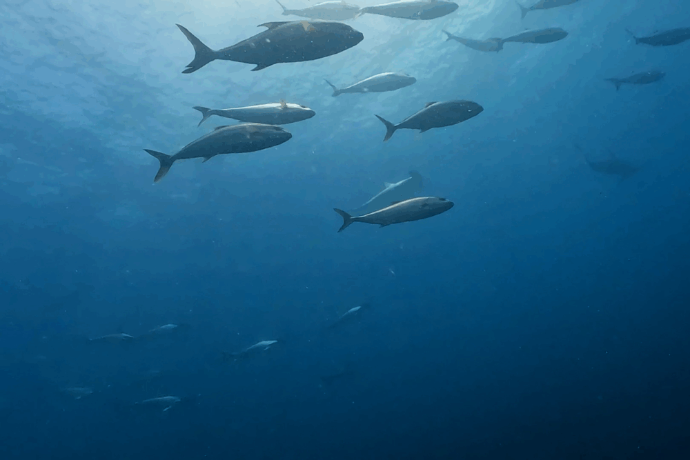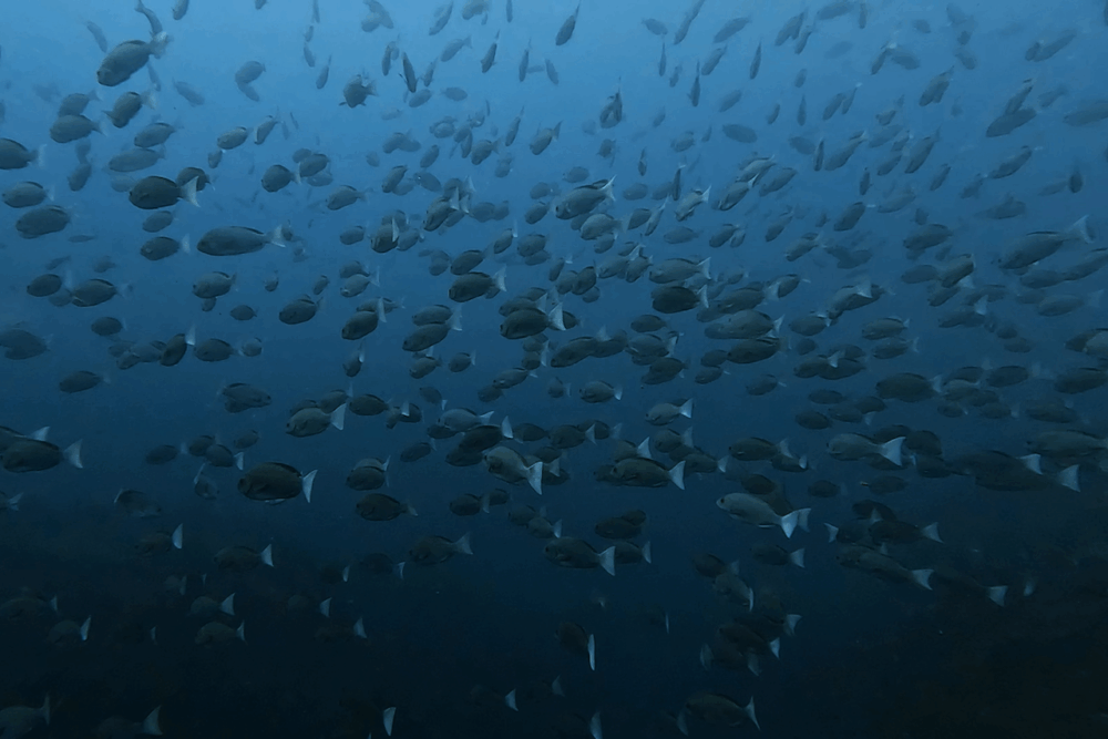 メジナ、ニザダイ、タカサゴ、ムロアジ、ツムブリが群れをなして流れます。