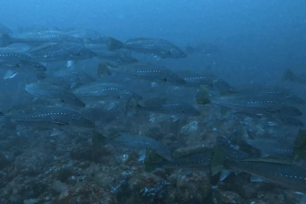 イサキ、タカベ、ニザダイ、メジナの群れが水中を埋め尽くし、ダイナミックな光景を演出。