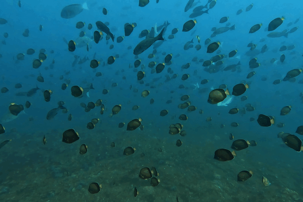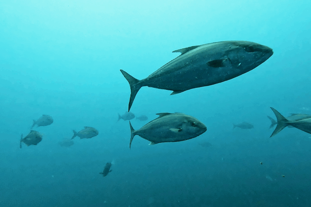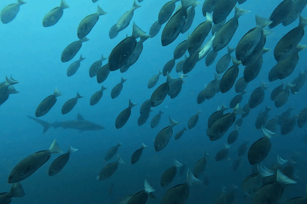 さらにメジロザメも多数確認され、安全停止中に足元を回遊する姿も登場。