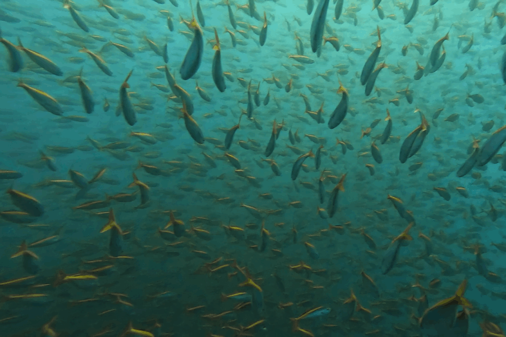 イサキ、タカベ、ニザダイ、メジナの群れが水中を埋め尽くし、迫力のある景観を演出。