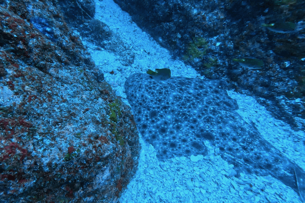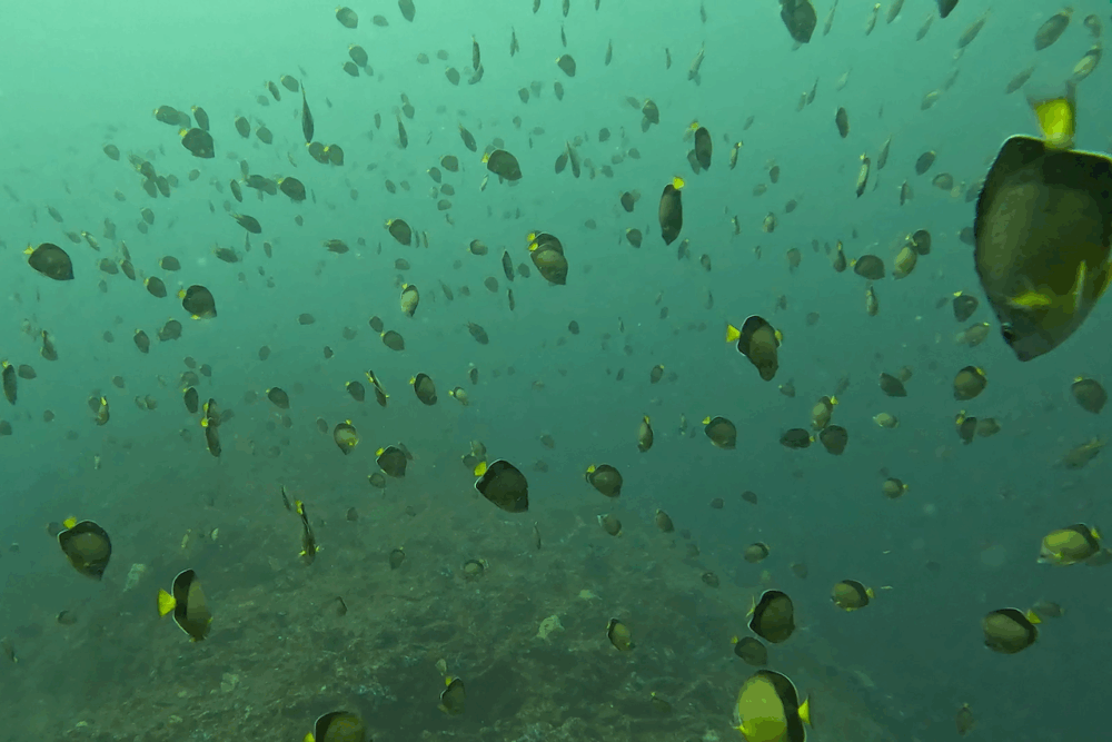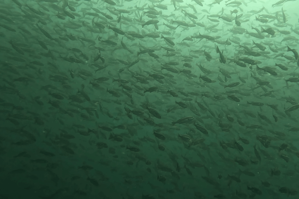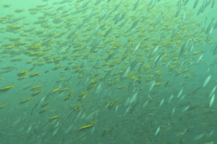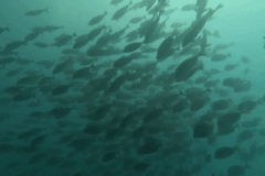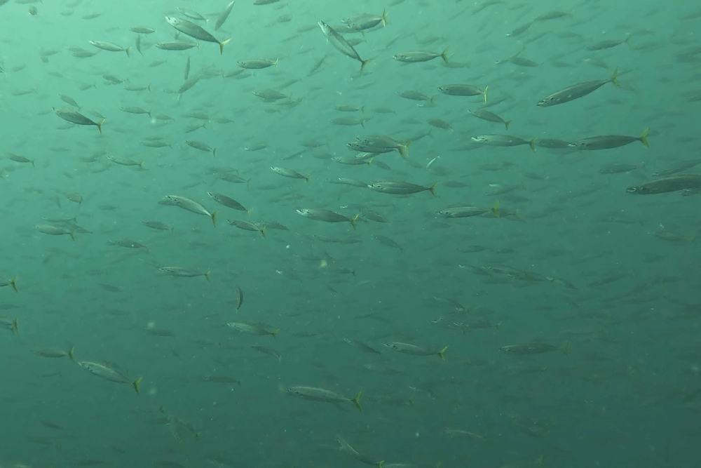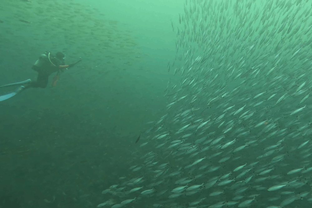 その群れの周りをクロヘリメジロザメがぐるぐると回遊する迫力のシーンも!