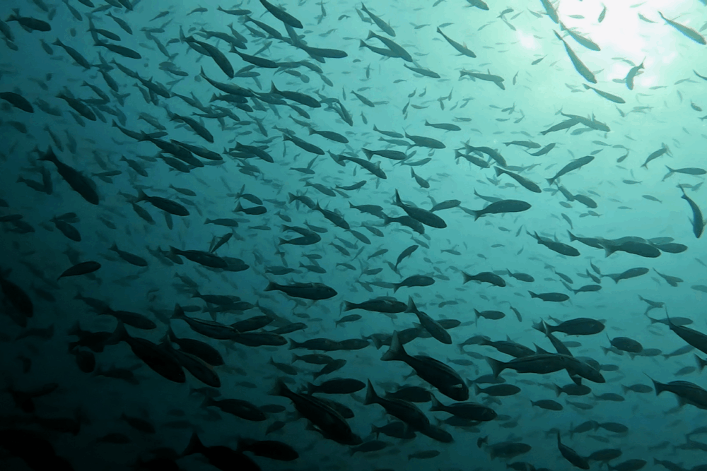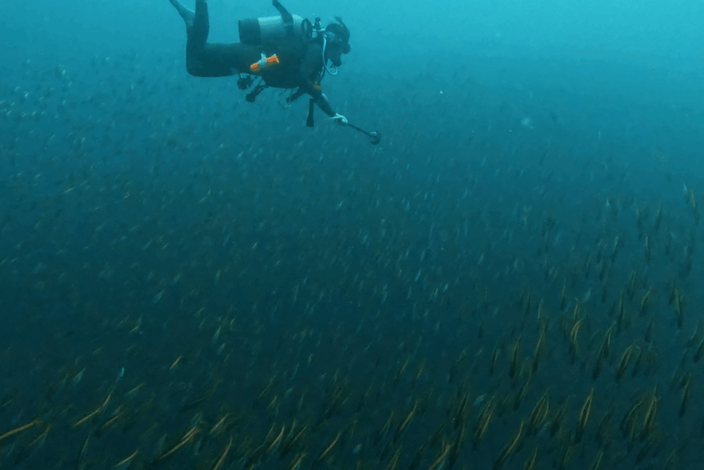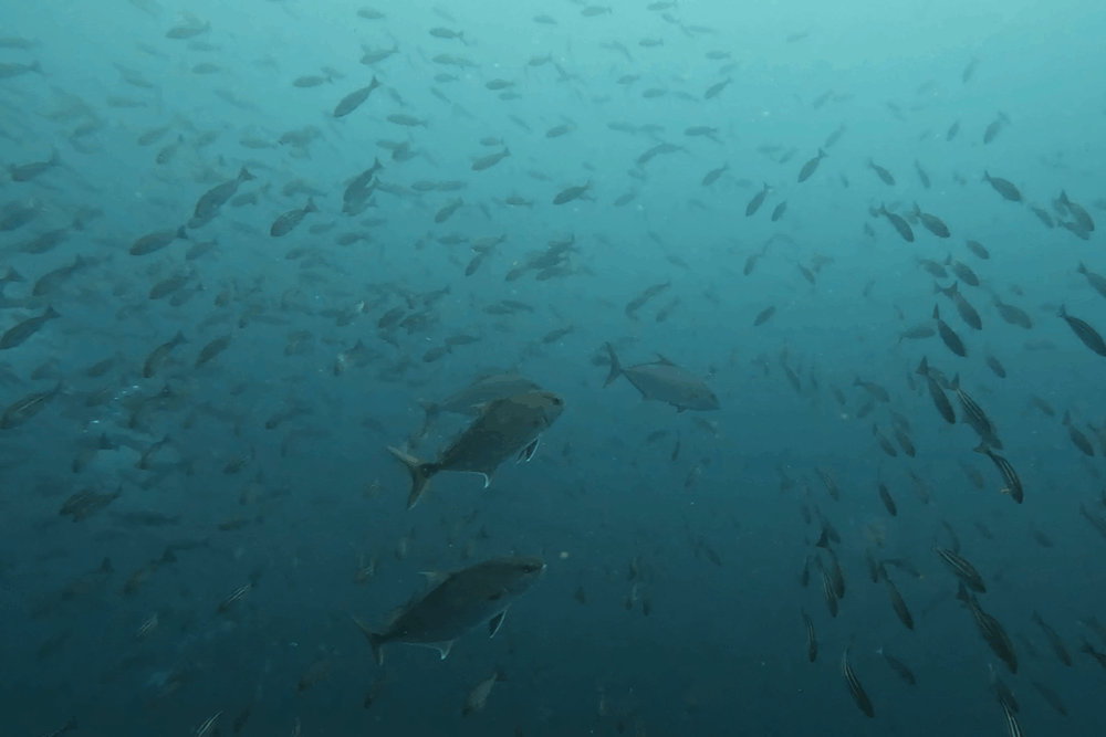 西側と合わせて、イサキ・タカベが水中を埋め尽くすように群れ、圧巻の光景を演出。