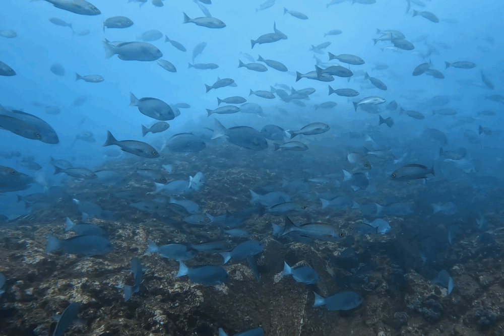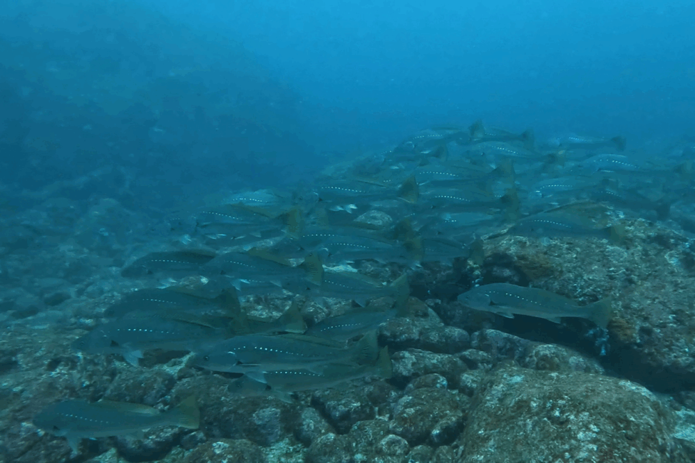 タカサゴ、メジナ、ニザダイは冷たい潮を避けるように浅場で群れを形成。