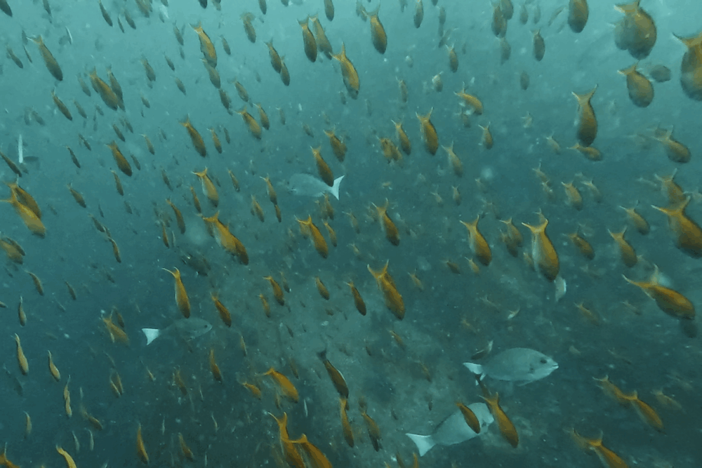 イサキ、タカサゴ、メジナ、ニザダイ、ムロアジが入り乱れ、常に群れに囲まれているような感覚。