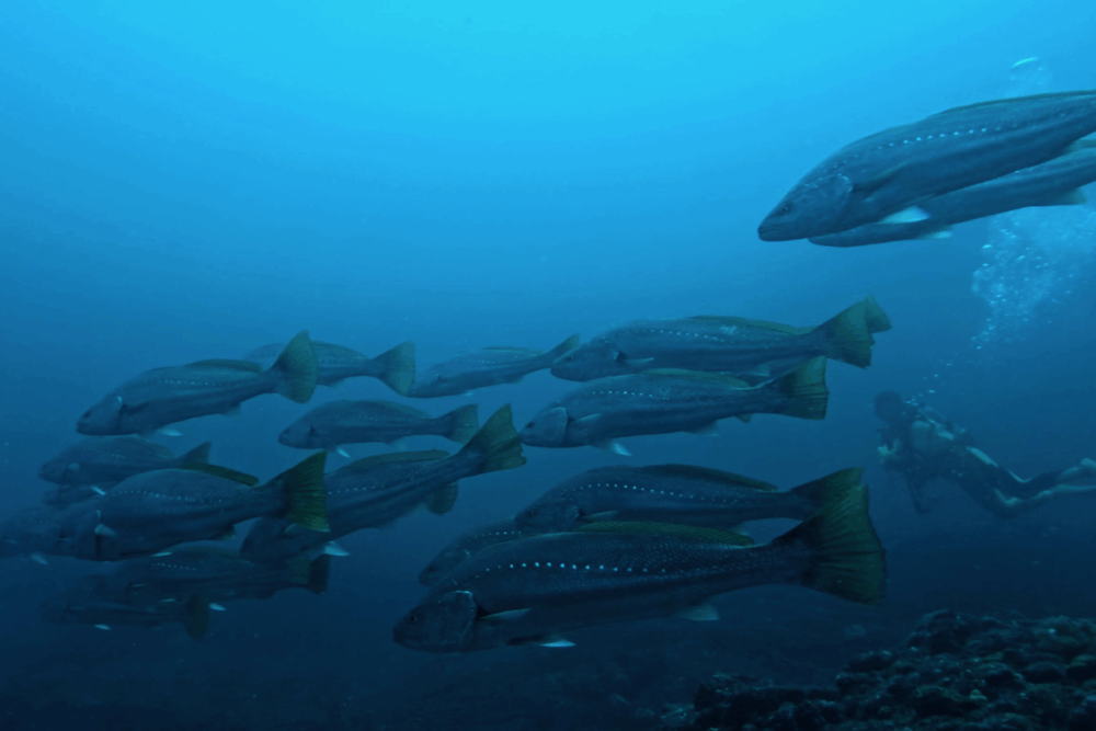 特にイサキの群れは圧倒的で、ダイバーの行手を塞ぐ「イサキウォール」を形成。